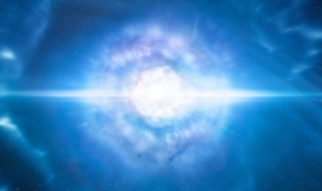 Սա սպիտակ անցքի երևակայական նկար է։ Սպիտակ անցքի գոյությունը գիտնականները դեռ չեն ապացուցել, սակայն ըստ հիպոթեզի այն սև անցքի հակառակն է։ Ի տարբերություն սև անցքերի, այն ոչ թե քաշում է օբյեկտներին, այլ դուրս է մղում նրանց։ Նրանք կարող են առաջանալ Մեծ պայթյունի հետևանքով։